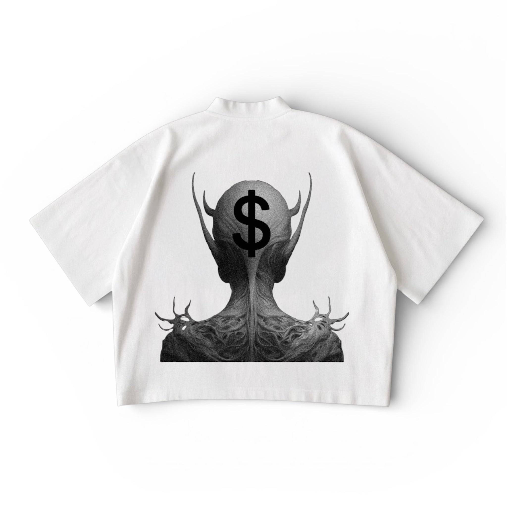 “The Property Collection design contrasts beauty and corruption fronted by a gorgeous woman symbolizing love and purity, while the demon on the back, branded with a money sign, represents how ego, wealth, and status can distort and destroy relationships. It’s a reminder that not everything glamorous is good for the heart.”